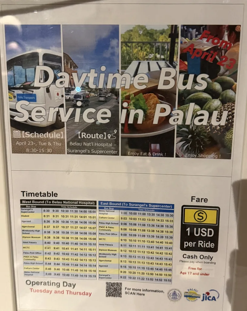 The new daytime bus: A recent eco-friendly addition! There is now a limited daytime bus service connecting major points in Koror and Babeldaob but only operates Tuesday and Thursday! It’s a great way to save money and sit back while someone else drives. $1 cost!